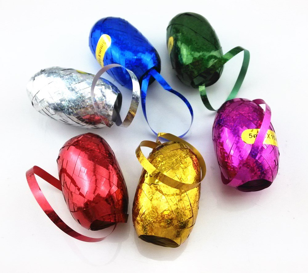 - Pack of 5 shiny, metallic foil ribbons in assorted colors.